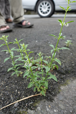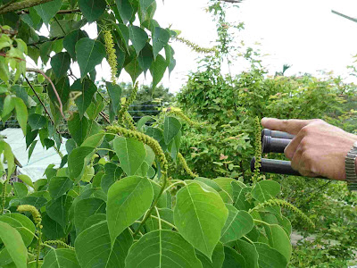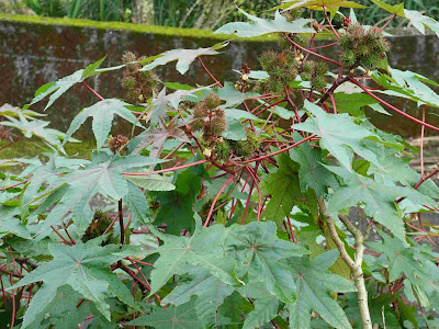 蓖麻,雄花著生花軸下部,與烏桕相反。這類的花一定都只能靠昆蟲授粉。全株有毒但果仁沒毒,果仁含有油脂可提煉為工業用油代用品。所以日本治台的1940年代種了許多的蓖麻,作為二戰時期的替用油。