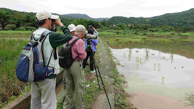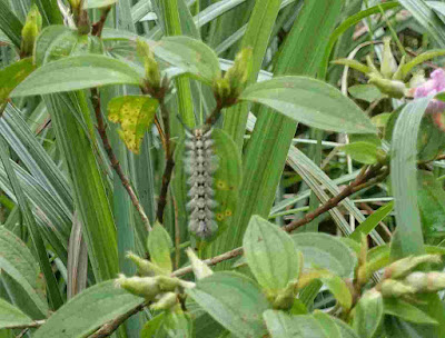 杜鵑葉蜂成蟲飛來飛去,還有數隻幼蟲正在進食。大部份杜鵑葉子被啃食到只剩葉脈中肋。